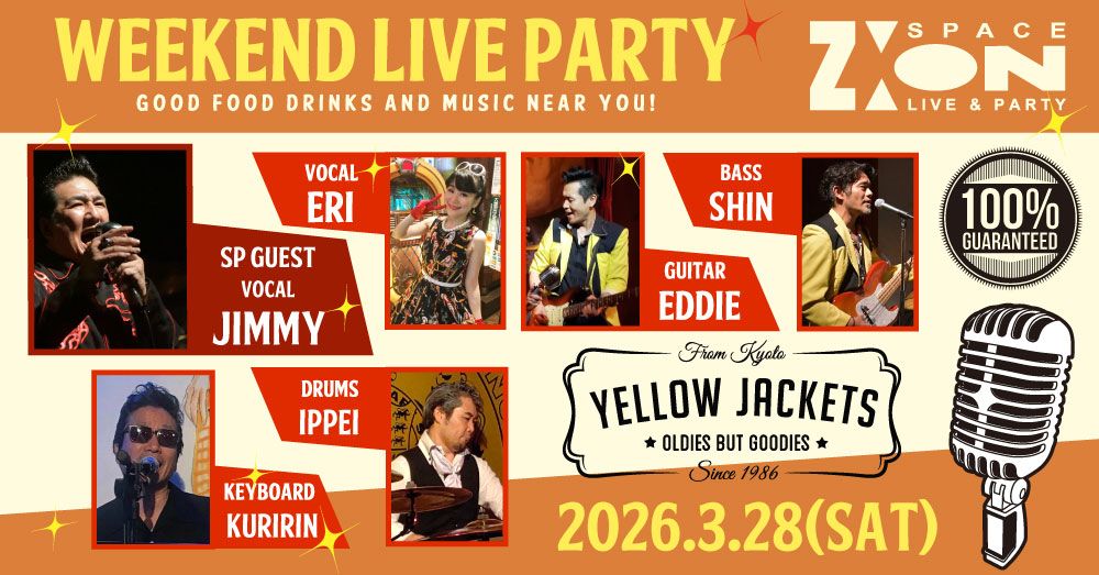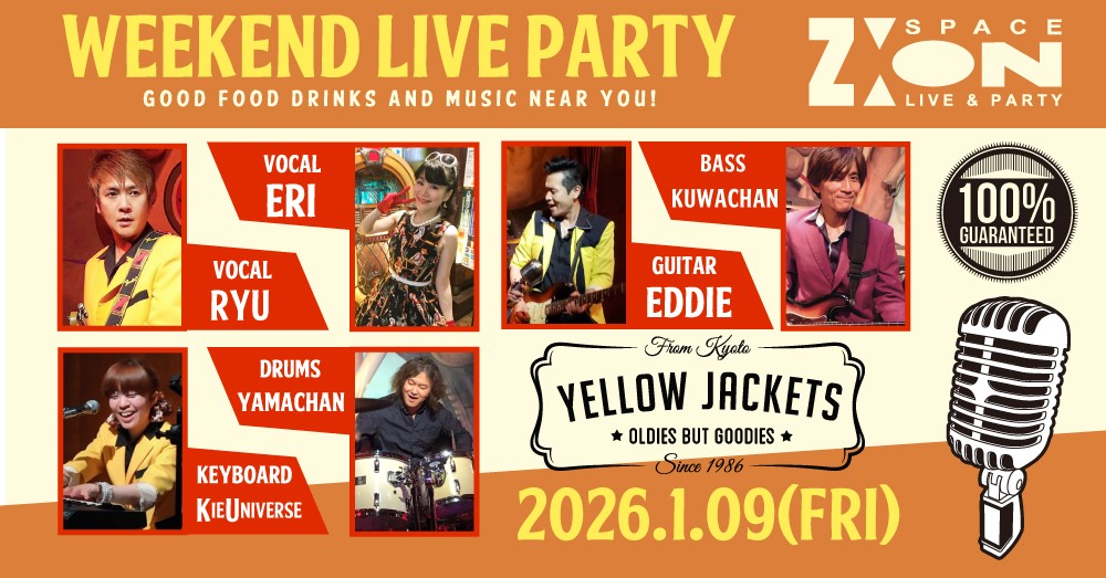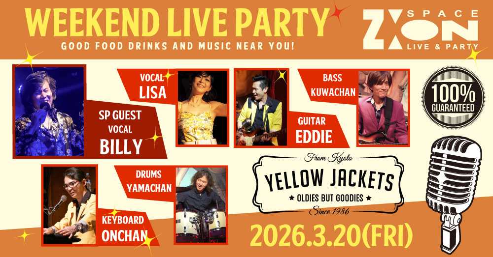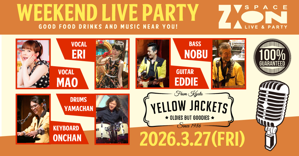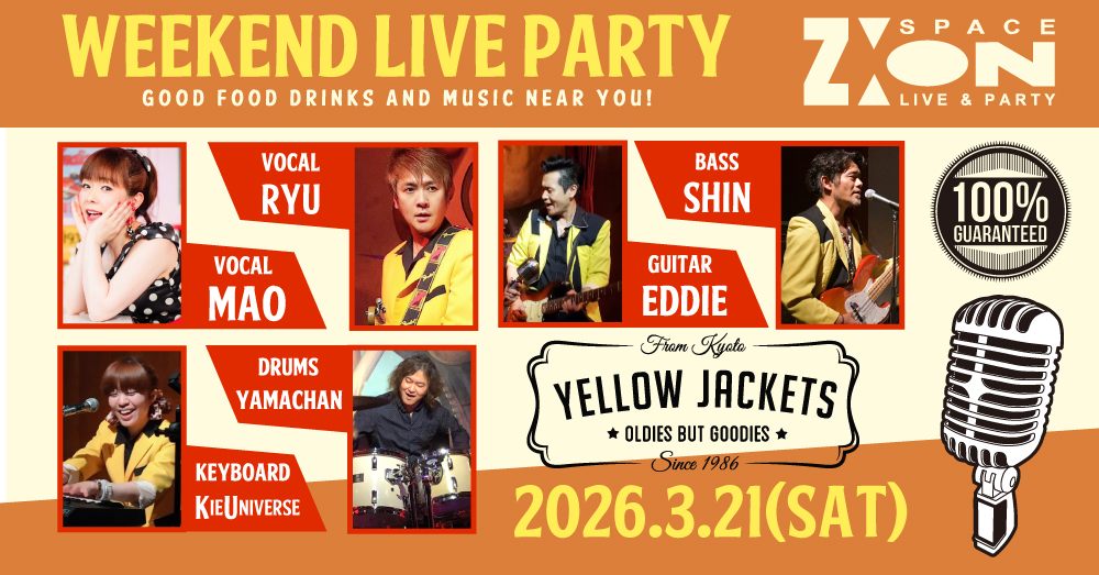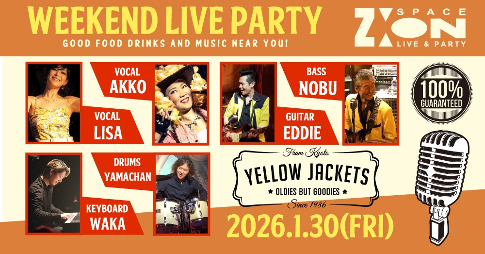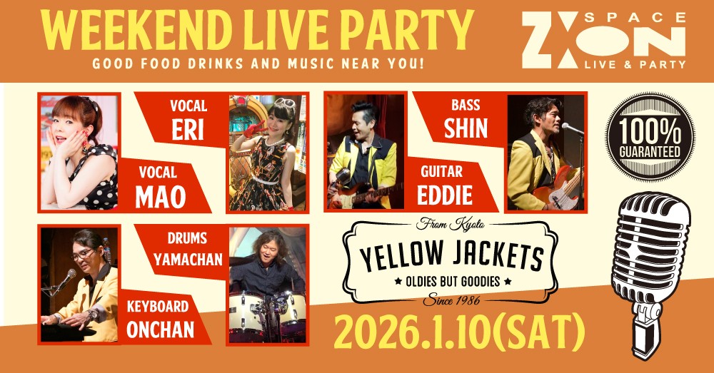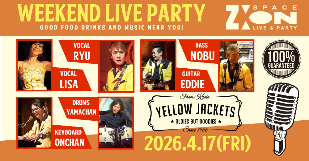 お店の名前は【スペース・ジオン】に変わりましたが、オールディーズを中心とした生バンドスタイルはそのまま引き継がれ、名前も変わらず【Yellow Jackets】で同じ場所、同じステージで生演奏をお届けしております。