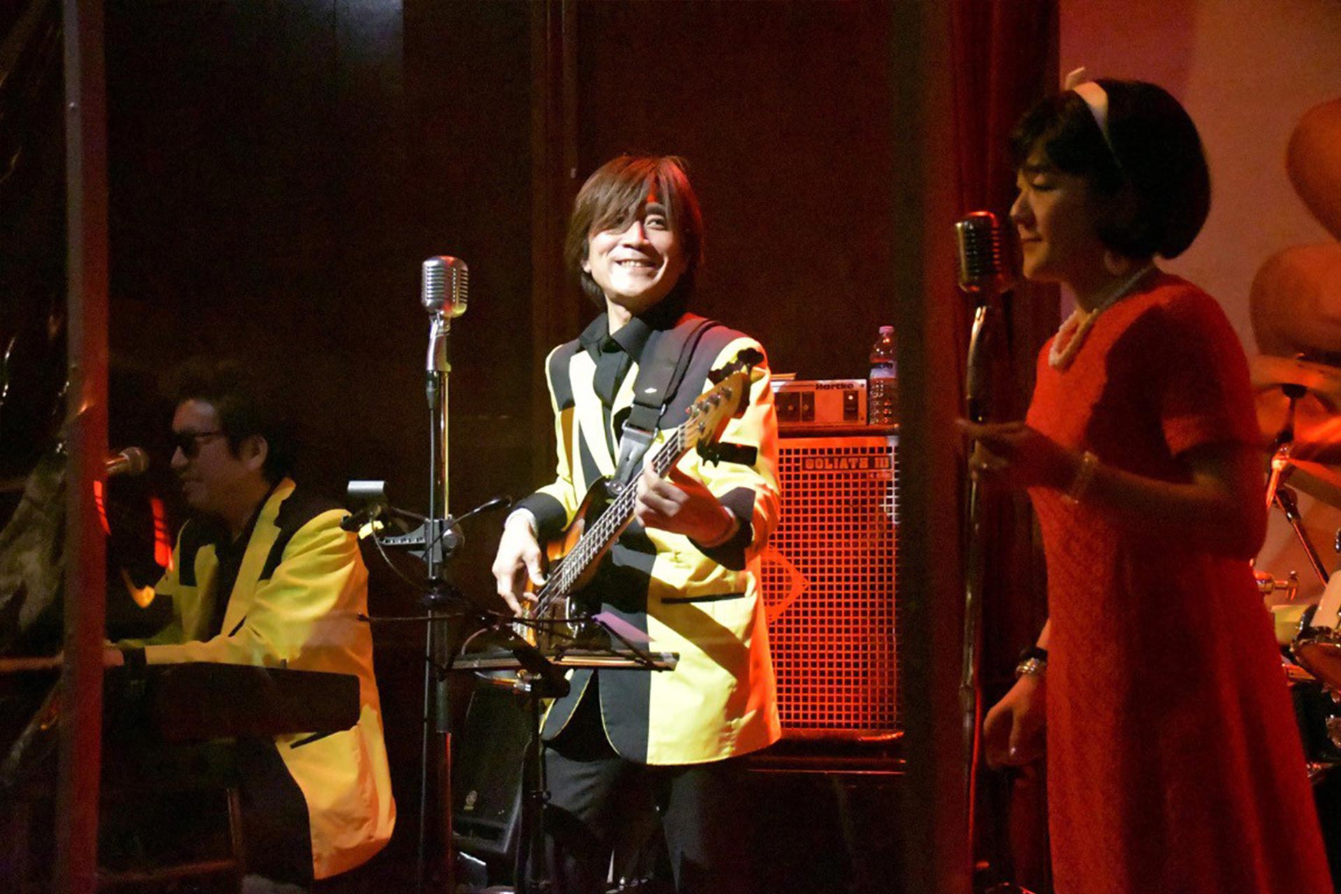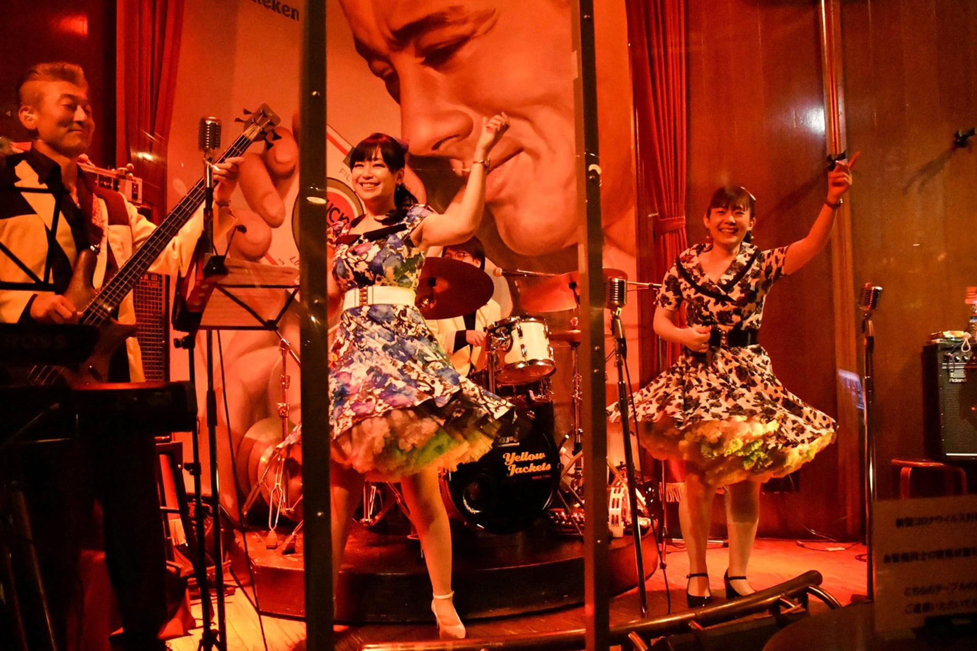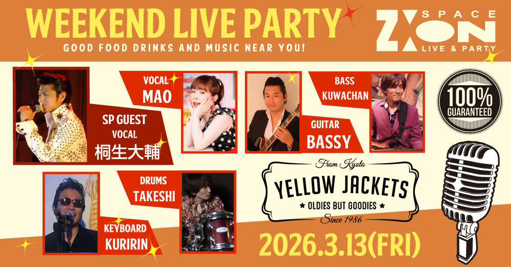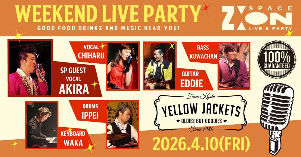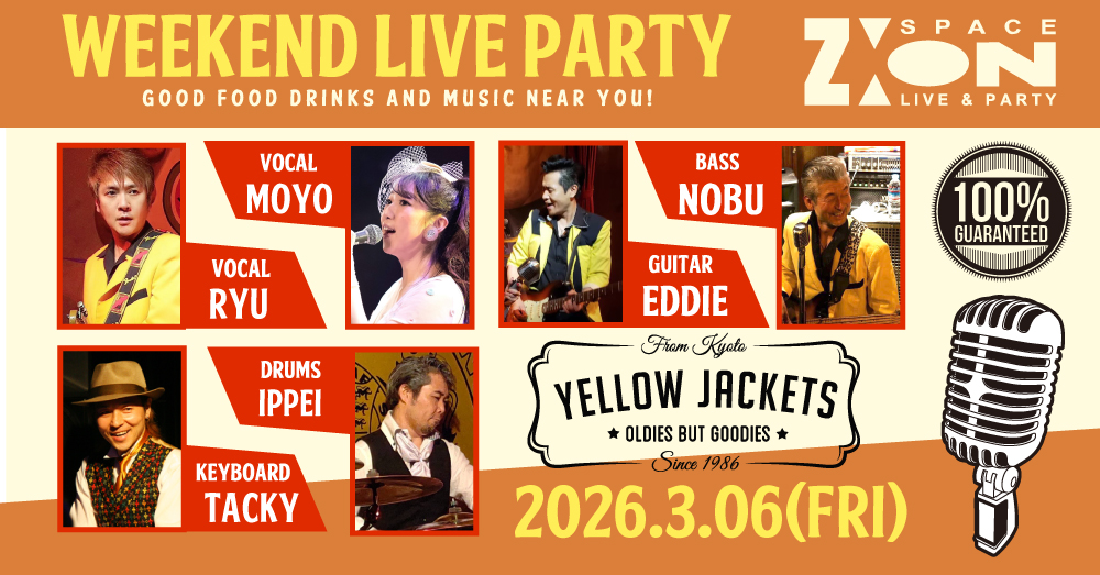 お店の名前は【スペース・ジオン】に変わりましたが、オールディーズを中心とした生バンドスタイルはそのまま引き継がれ、名前も変わらず【Yellow Jackets】で同じ場所、同じステージで生演奏をお届けしております。